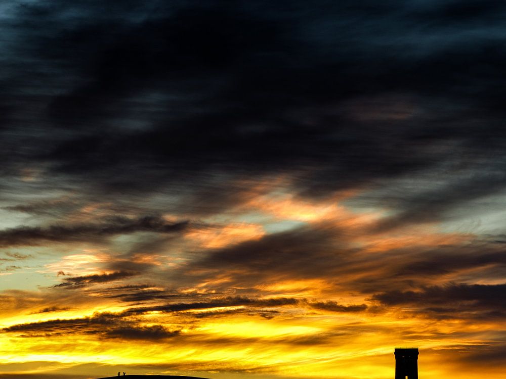 De vuurtoren van Rubjerg Knude in silhouet tegen de avondlucht. Door de lucht de ruimte te geven blijft de toren en de omliggende duinen slechts zichtbaar in silhouet. Door restauratie werkzaamheden is de top van de toren tijdelijk naast de toren gezet, wat een vervreemdend beeld oplevert.
