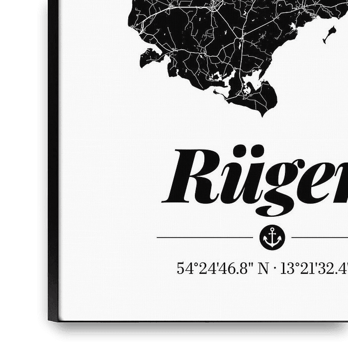 Rügen – die Urlaubs-Insel vor der Ostsee-Küste bei Stralsund als dekoratives Landkarten-Design. Minimalistisches Landkarten-Motiv für Rügen-Fans– die stilvolle Deko-Idee, auch als Geschenk.