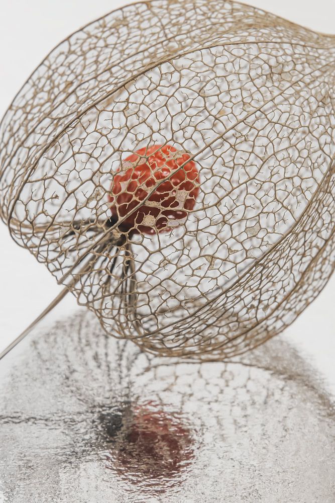 "Ruhe und Einfachheit in natürlichen Farben: Eine Lampionpflanze" ist ein Bild einer Lampionpflanze, die schon fast verdaut ist. Das Skelett der Adern ist dadurch schön zu sehen. Auf dem grau-silber-beigen Hintergrund ist die Reflexion der Laterne zu sehen. Die natürlichen Farben verleihen dem Bild unter anderem ein friedliches Aussehen.