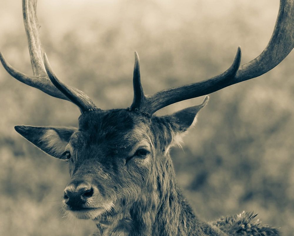 Ein schönes Tier, ein Hirsch mit großem Geweih, ruht im Gebüsch.