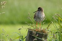 Ein Rotschenkel macht ein Nickerchen auf einer Stange zwischen dem Grün