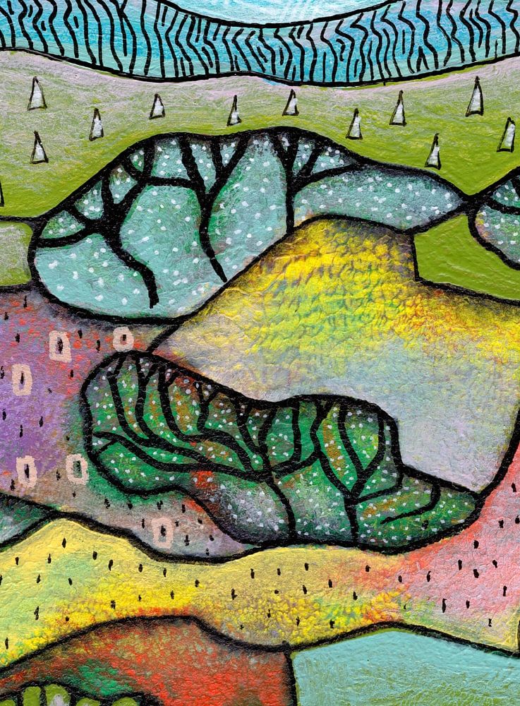 Epische Landschaft auf Papier, Originalkunstwerk. Abstraktes dekoratives Kunstwerk in einem zeitgenössischen minimalistischen Stil.