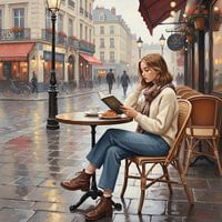 Ein junges Mädchen sitzt friedlich in einem kleinen Straßencafé, vertieft in ihr Buch, während sich um sie herum der sanfte Rhythmus einer europäischen Stadt entfaltet. Die Szene fängt einen ruhigen, besinnlichen Moment ein, in dem sanfter Regen die Kopfsteinpflasterstraße glitzern lässt, beleuchtet von warmen Straßenlaternen. Sie ist…