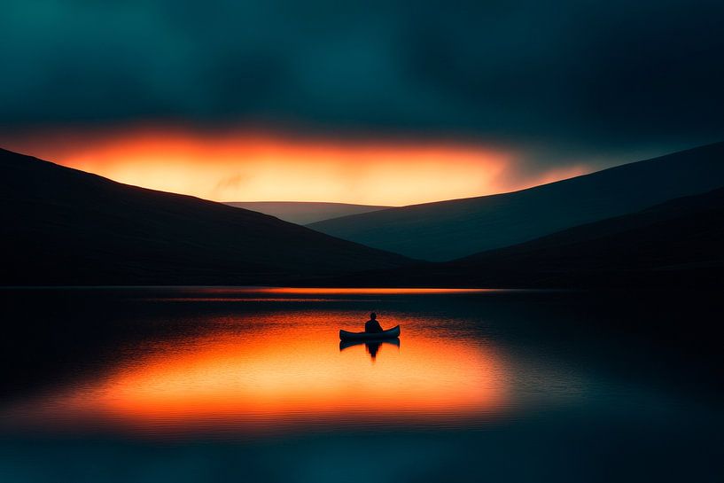 In mystischem Dämmerlicht paddelt ein einzelnes Boot über einen spiegelglatten See, umrahmt von sanften Hügeln. Der aufregende Kontrast zwischen den dunklen Schatten und dem leuchtenden Orange am Horizont vermittelt Ruhe und Abenteuerlust zugleich. Diese Szenerie passt perfekt in ein Wohnzimmer, wo sie zur Entspannung und zum Träumen…