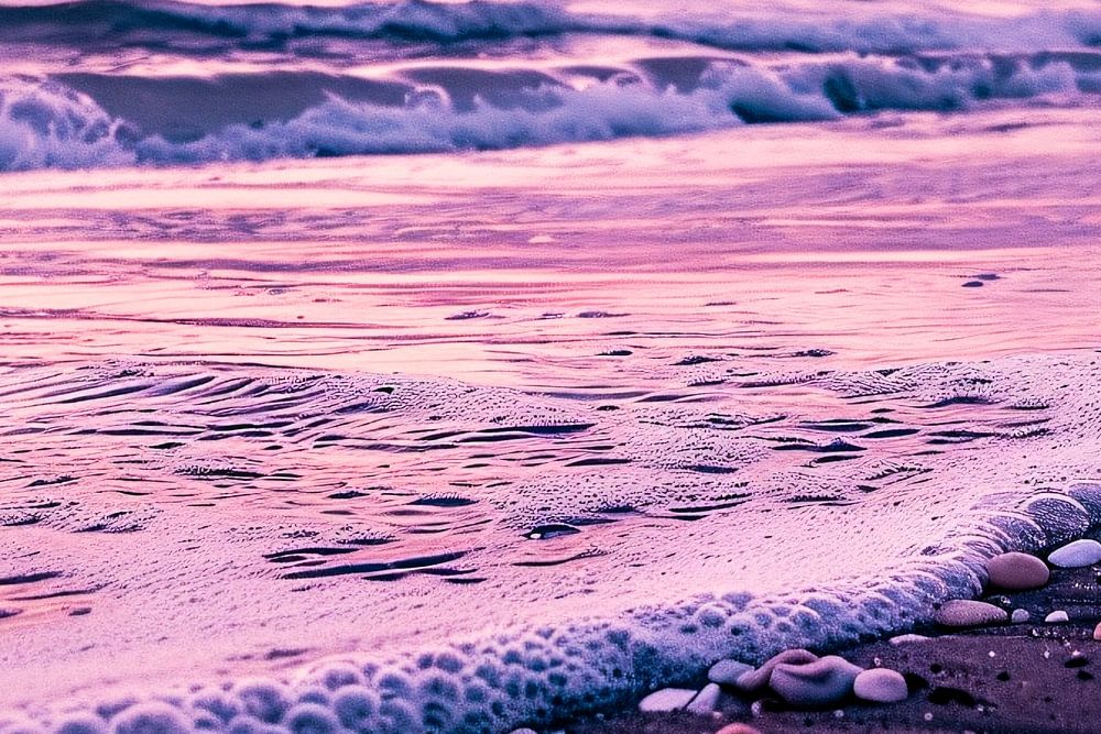 Dieses schöne Design zeigt eine ruhige Strandszene bei Sonnenaufgang. Der Himmel ist in sanfte rosa und violette Farbtöne getaucht, die sich im schäumenden Wasser der Wellen spiegeln. Der Strand ist mit verschiedenen Muscheln übersät, die eine natürliche und beruhigende Atmosphäre schaffen. Dieses Bild ist perfekt, um einem Raum ein Gefühl von Entspannung und natürlicher Schönheit zu verleihen. Ideal für Schlafzimmer, Wohnzimmer oder andere Orte, an denen Sie eine beruhigende Stimmung schaffen wollen.
