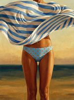Dieses Gemälde fängt die Essenz eines flüchtigen, ruhigen Moments am Meer ein, in dem das Zusammenspiel von Licht, Bewegung und Textur eine Geschichte von Freiheit und Verbundenheit mit der Natur erzählt. Das Motiv ist zwar gesichtslos, verkörpert jedoch ein universelles Gefühl von Muße und Selbstentfaltung. Die gebräunte Haut steht im…