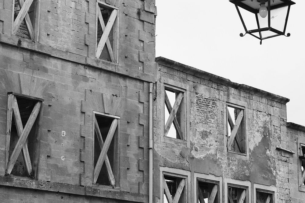 Die Ruinen des "Refuge des moines d'Orval" in der Zitadelle von Montmédy, im Département Meuse in Lothringen in Frankreich. Stimmungsvolle Schwarz-Weiß-Architektur von verlassenen Gebäuden.