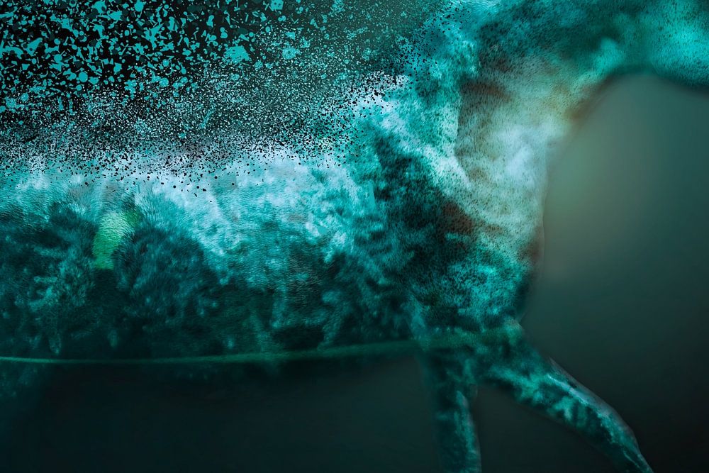 Arabisches Vollblut im futuristischen Stil, das Pferd verschwindet im Raum und läuft dem Licht entgegen.