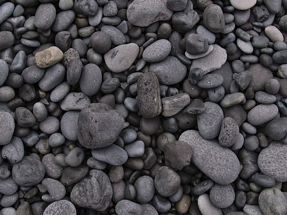 Nahaufnahme runder, grauer Steine aus Vulkangestein am Strand Djúpalónssandur an der Küste der Halbinsel Snæfellsnes im Westen von Island.