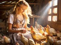 Eine junge Frau sitzt in einer sonnendurchfluteten Scheune, umgeben von Hühnern, eingefangen in einer warmen, ländlichen Atmosphäre. Das natürliche Licht, die rustikalen Strukturen und die ungezwungene Komposition vermitteln Einfachheit, Tradition und ländlichen Charme.