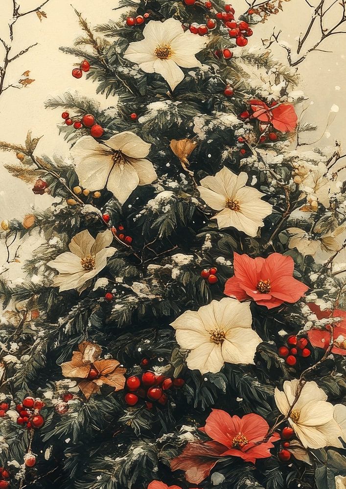 Ein bezaubernder Weihnachtsbaum mit lebhaften Blumen- und Herzmustern vor einem verwitterten Hintergrund.