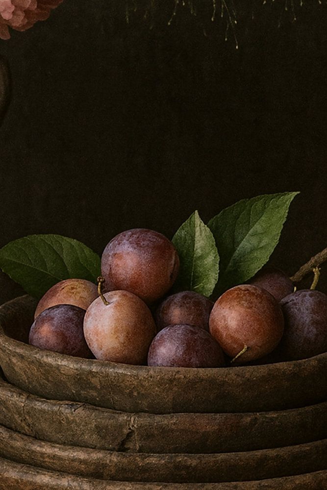 Ein zeitloses Stillleben, bei dem die warmen Töne von Holzschalen und reifen Pflaumen wunderbar mit den zarten Blumen im Hintergrund verschmelzen. Dieses Kunstwerk strahlt Ruhe, Eleganz und klassische Raffinesse aus - ein perfekter Blickfang für ein stimmungsvolles Interieur.