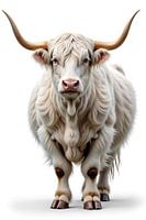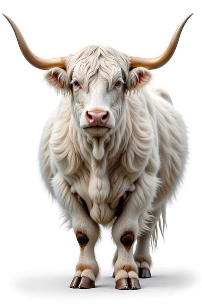 In kraftvoller Ruhe tritt das schottische Hochlandrind aus dem grenzenlosen Weiß hervor, als wäre es aus uralter Substanz und Licht zugleich geformt. Sein dichtes, fließendes Fell wirkt wie eine lebendige Struktur, die jede Bewegung des Lichts sanft aufnimmt. Die weit geschwungenen Hörner sind von edlen goldenen Akzenten durchzogen, die…