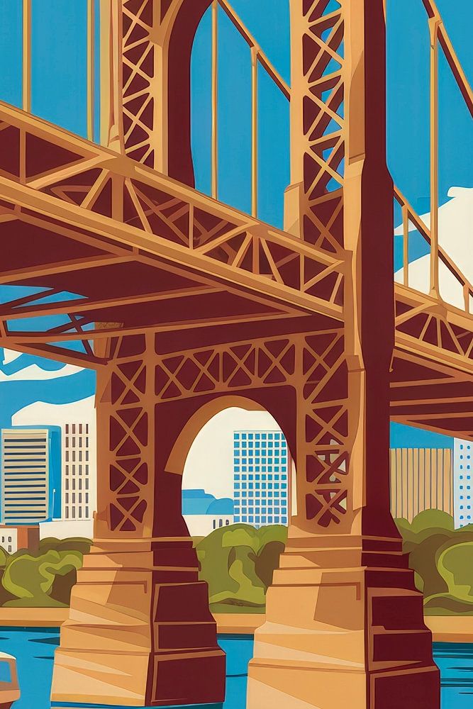 Goldene Brückenbögen über glitzerndem Wasser, umrahmt von sanften Wolken und einer modernen Stadtsilhouette – dieses Kunstwerk fängt die Essenz von Sacramento perfekt ein. Die lebendige Farbpalette und der nostalgische Stil verleihen jedem Raum ein Gefühl von Abenteuer. Ideal für das Wohnzimmer, um Gespräche anzuregen und Erinnerungen zu wecken.