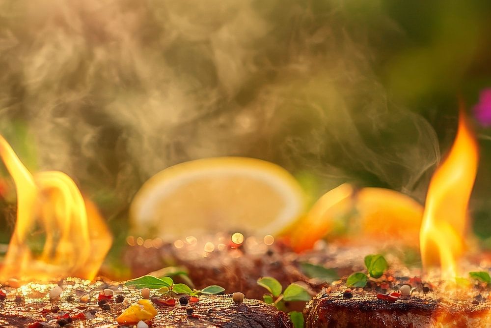 Ein feuriges Grillfest in voller Blüte! Saftige Steaks mit züngelnden Flammen ziehen den Blick magisch an, umgeben von bunten Gemüse und frischen Zitronenscheiben. Die goldene Abendsonne verleiht dem Moment eine warme Note. Ideal für die Küche oder den Essbereich, schafft dieses Bild einladende Stimmung für gesellige Runden und kulinarische Abenteuer.