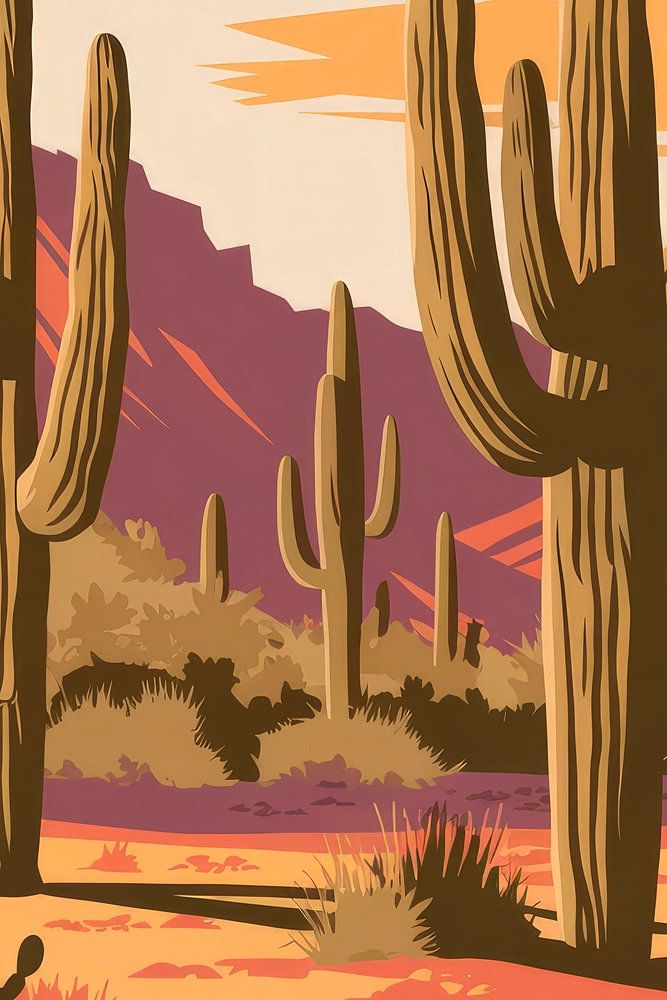In warmen Erdtönen erheben sich majestätische Saguaro-Kaktusse vor einer beeindruckenden Bergkulisse, während der Sonnenuntergang den Himmel in sanfte Farben taucht. Diese harmonische Darstellung der Natur versprüht Ruhe und Abenteuerlust und eignet sich perfekt für das Wohnzimmer, um eine einladende Atmosphäre zu schaffen und von fernen Reisen zu träumen.