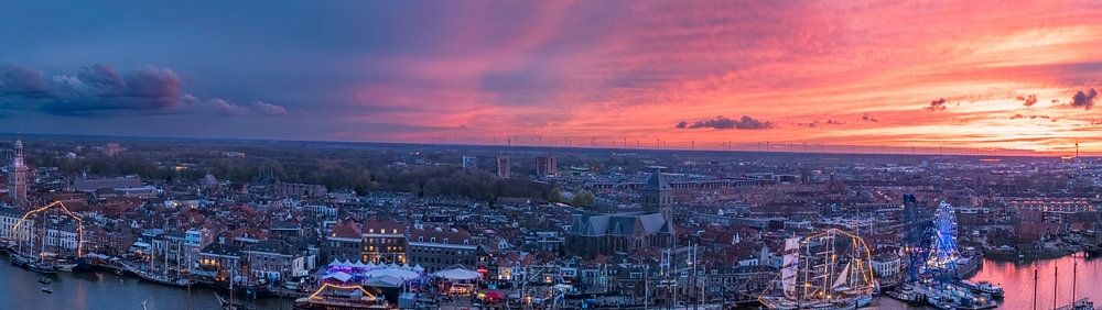 Kampen und die IJssel bei der traditionellen Flottenschau zu Beginn der Sail Kampen 2024 in der Hansestadt am Ende eines frühlingshaften Tages mit einem farbenfrohen Sonnenuntergang am Himmel.
