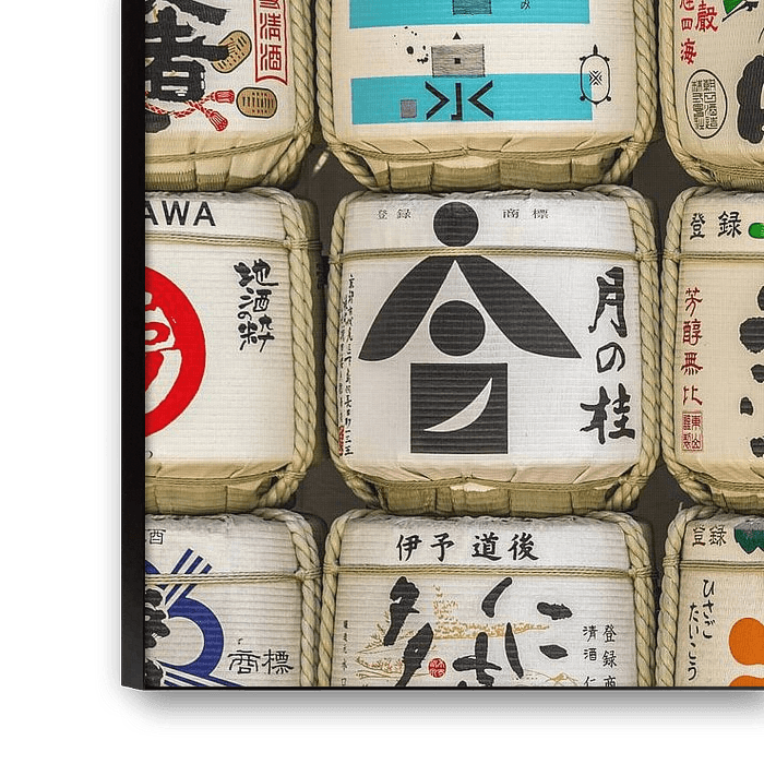 Sakefässer auf einem Haufen mit schönem Druck von Text und Zeichnungen in japanischer Sprache. Sake ist ein für Japan typisches alkoholisches Getränk.