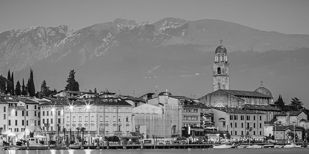 Ein 2:1-Stadtbild in Schwarz-Weiß von einem Abend in Salò, einer Stadt am Gardasee in der Lombardei in Norditalien. Salò hat auch die längste Promenade am Gardasee.