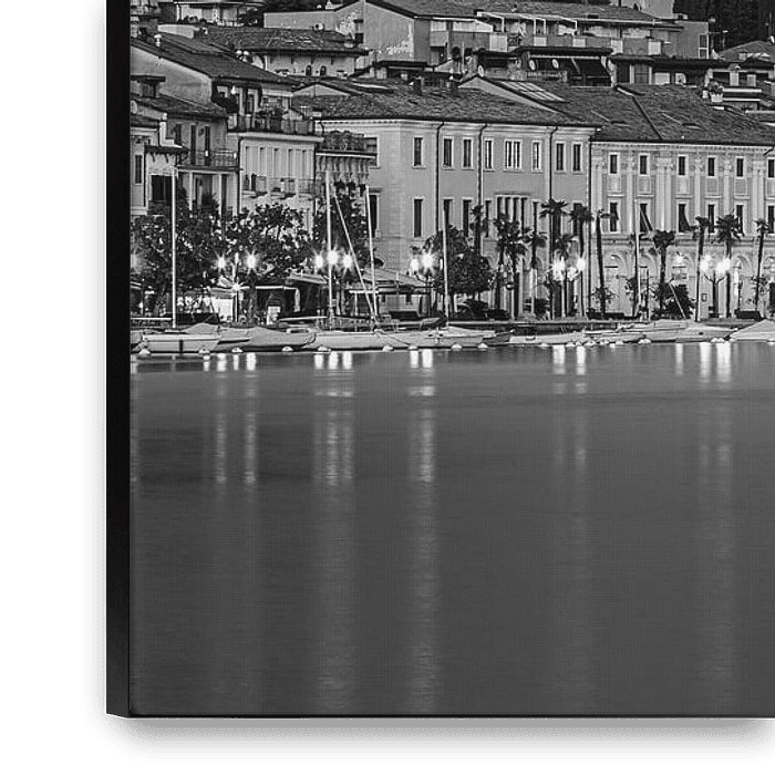 Ein 2:1-Stadtbild in Schwarz-Weiß von einem Abend in Salò, einer Stadt am Gardasee in der Lombardei in Norditalien. Salò hat auch die längste Promenade am Gardasee.