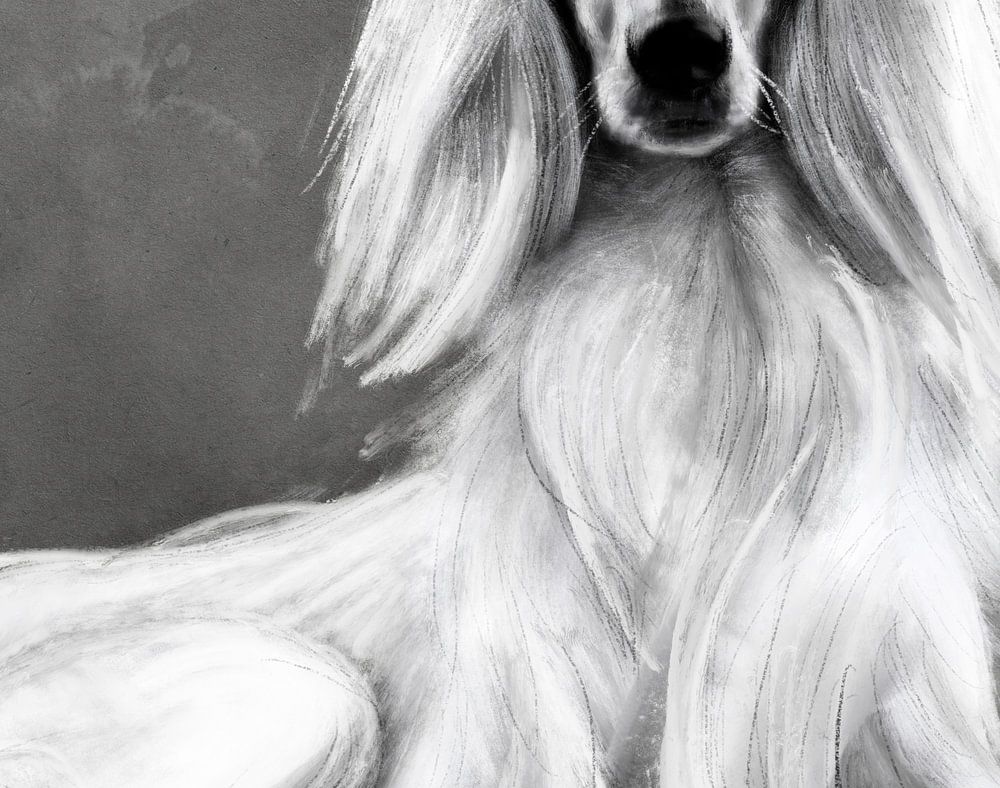 Porträt eines liegenden Saluki in Schwarz-Weiß-Tönen.
