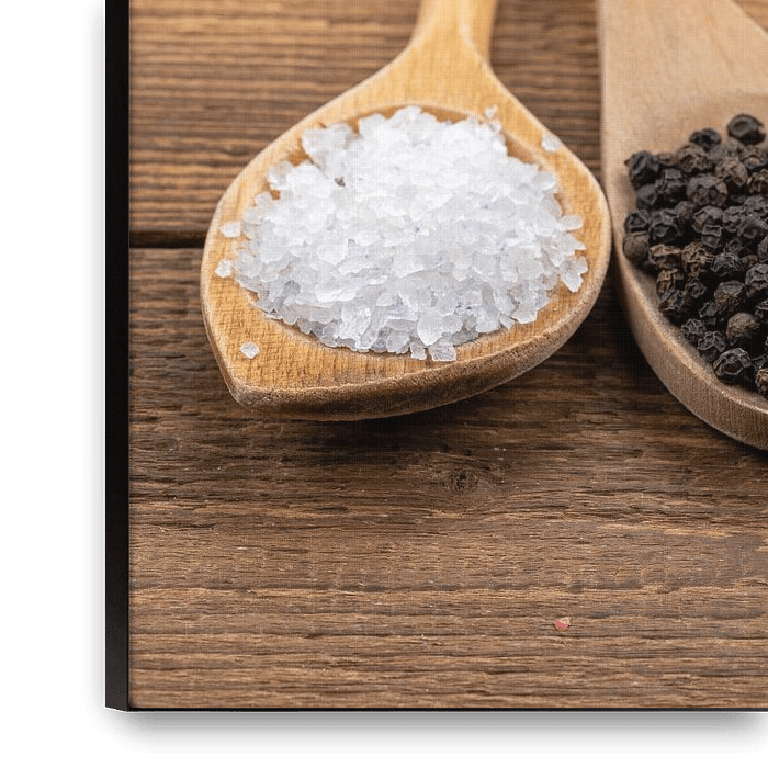 Ganze schwarze Pfefferkörner und blaues Kristallsalz auf zwei hölzernen Kochlöffeln auf einem rustikalen Hintergrund