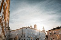 Die schöne historische Stadt, gelegen am Rande Österreichs, zwischen den Bergen der Alpen, mit besonderer Architektur und Sonnenuntergang.