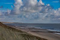 Bestelle dieses Landschafts-Wandbild Salzlandstrand mit blauem Himmel von anne droogsma als Reproduktion auf Leinwand, Alu-Dibond, als Poster, Fototapete oder Acrylglasbild.