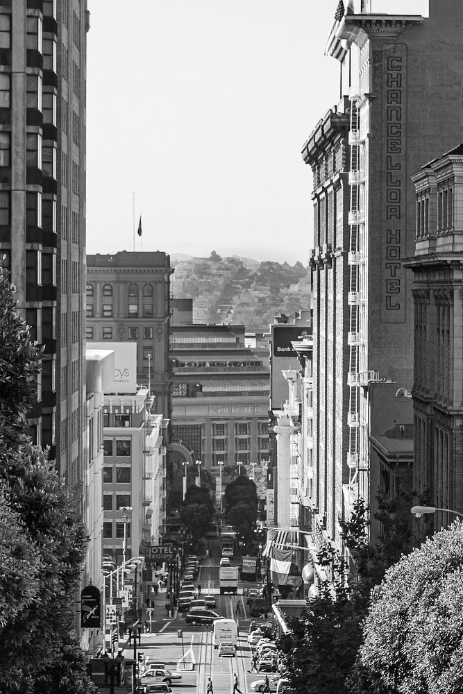 Eine Schwarz-Weiß-Fotografie der Straßen von San Francisco mit der berühmten Cable Car Linie, gesehen von der Powell Street, Kreuzung Bush Street, in Richtung Union Square.