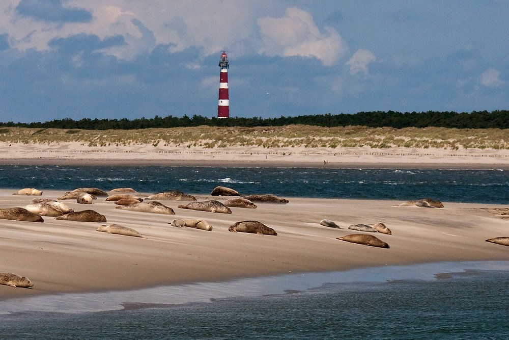 Eine Sandbank im Wattenmeer zwischen Ameland und Terschelling ist mit vielen Robben gefüllt, die in der Sonne faulenzen. Im Hintergrund ist die Bornrif der Leuchtturm in Hollum auf Ameland gesehen.