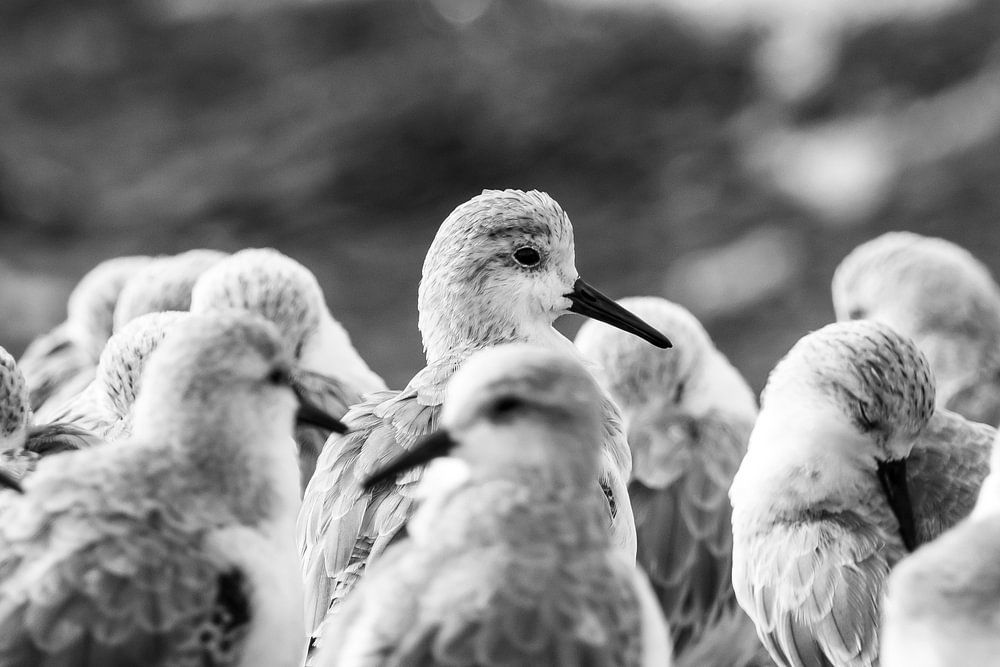 Diese Schwarz-Weiß-Fotografie zeigt eine Gruppe von Sanderlingen - dicht beieinander auf einem Felsen. Ihr helles Gefieder mit dunklen Akzenten auf den Flügeln und dem Rücken verleiht ihnen eine subtile Textur, während der unscharfe Hintergrund die Aufmerksamkeit ganz auf die Vögel lenkt. Der monochrome Ton verstärkt das Gefühl von Ruhe und Kontemplation, als ob die Zeit in diesem Moment des Zusammenseins in der Natur für einen Moment stillsteht.
