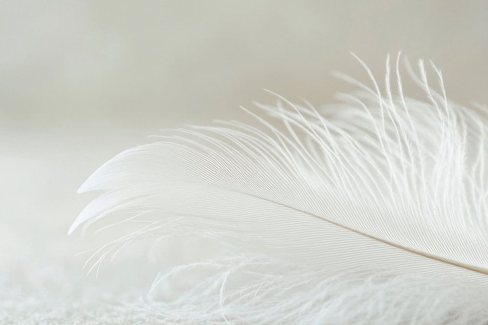 Ein sanftes Spiel aus Licht und Textur entfaltet sich hier: Eine zarte, weiße Feder ruht gleichsam verletzlich und anmutig auf einem sanften Hintergrund. Ihre filigranen Härchen scheinen im feinen Licht zu tanzen, während die schlichte Eleganz und die Leichtigkeit des Moments den Betrachter zur Besinnung einladen. Ein Hauch von Freiheit und Ruhe in einem einzigen Augenblick.