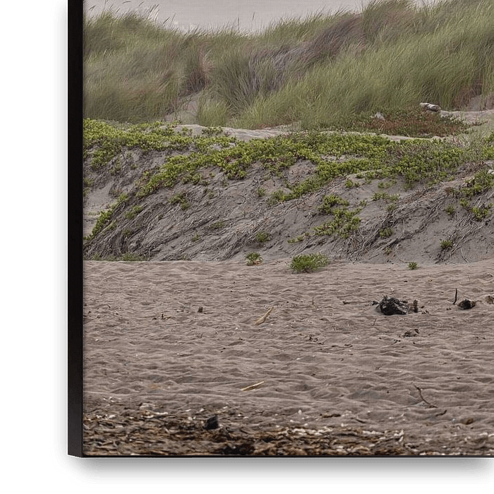 Unter einem bewölkten Himmel ist ein Sandstrand mit grüner Vegetation zu sehen. Ein Stück Treibholz liegt am Strand, und ein Vogel fliegt über den Strand. Fotografiert vom Morro Rock Beach (Morro Bay, Kalifornien).