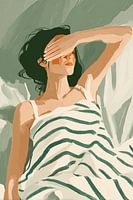 Diese zeitgenössische minimalistische Illustration zeigt eine Frau, die ihre Augen vor dem Licht schützt, eingefangen in ausdrucksstarken malerischen Strichen und einer zurückhaltenden, erdigen Farbpalette. Fließende Linien, organische Strukturen und gedämpfte Grüntöne vermitteln Ruhe, Introspektion und stille Widerstandsfähigkeit. Die…