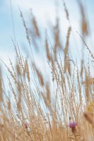 An der Südküste Englands wiegen sich die Gräser im Wind. Das neutrale Beige kontrastiert mit dem blauen Himmel und der einen lila Distel.