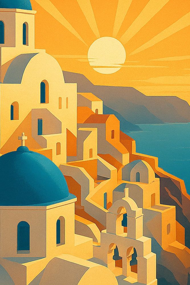 Dieses Kunstwerk fängt die atemberaubende Schönheit der griechischen Insel Santorin mit ihren weiß getünchten Häusern und blau getünchten Kirchen auf den Klippen über dem Ägäischen Meer ein. Der glühende Sonnenuntergang im Vintage-Art-Déco-Stil strahlt goldene Strahlen über die Szene und unterstreicht die architektonische Harmonie der Insel und die atemberaubende Aussicht auf die Küste. Kräftige Gold-, Blau- und Orangetöne schaffen eine Komposition, die sowohl romantisch als auch zeitlos wirkt.