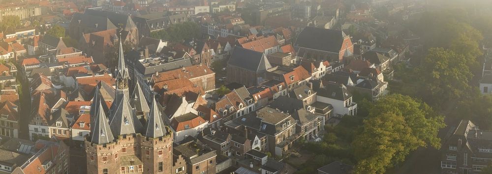 Blick auf den Sassenpoort in der Stadt Zwolle, Overijssel, Niederlande, an einem schönen Sommermorgen mit einem dunstigen Nebel über der Stadt von oben gesehen.