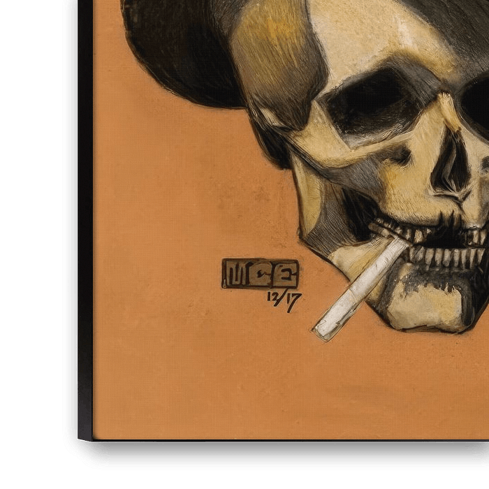Eschers Thema und Ausführung in "Schädel mit Zigarette" spiegeln expressionistische Empfindungen wider und vermitteln Angst und Selbstbetrachtung. Der Schädel, ein Symbol für die Sterblichkeit und die Vergänglichkeit des Lebens, hat eine eindringliche Präsenz, während die Zigarette eine starke Erinnerung an zeitliche Freuden und Laster ist.