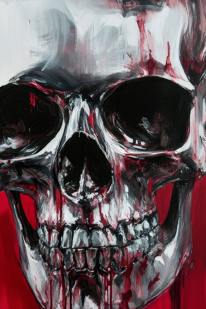 Eine kraftvolle Fusion aus Licht und Schatten fängt den Blick: ein strahlendes, silbernes Totenschädel-Design auf blutrotem Hintergrund, der Emotionen und Tiefe weckt. Diese markante Darstellung setzt einen eindrucksvollen Akzent und eignet sich hervorragend für das Wohnzimmer, wo sie spannende Gespräche anstoßen kann.