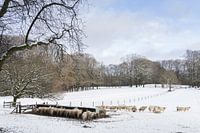 Schafherde auf der Veluwe in einer Winterlandschaft.