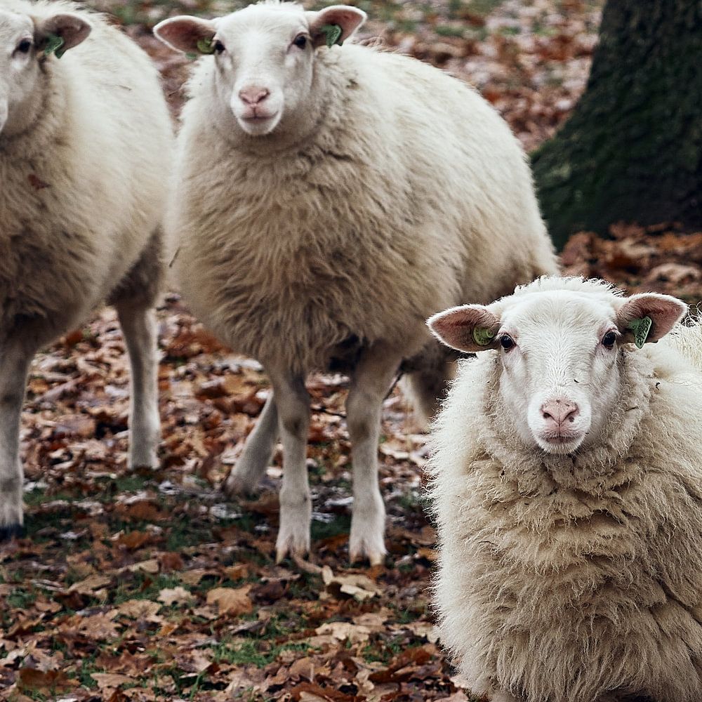 Niederländische Schafe in einer niederländischen Moorlandschaft. Neugierig wie sie sind, schauen sie direkt in die Kamera und in Ihr Wohnzimmer. Die Winterlandschaft scheint sie mit ihrem dicken, wolligen Fell nicht zu stören.