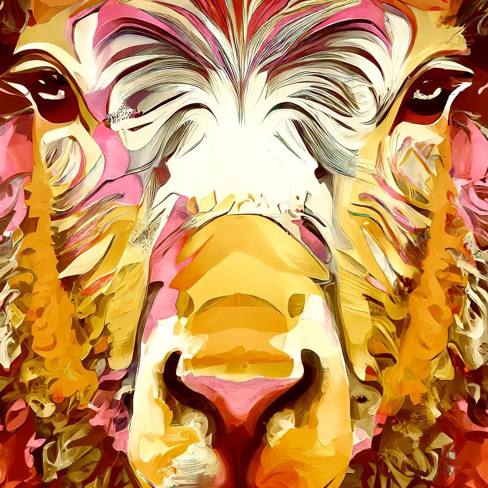 Dies ist das gemalte Porträt eines Schafes. Ein Acrylgemälde, das in lockeren Pinselstrichen und in schönen warmen Rot-Orange-Tönen gehalten ist.
