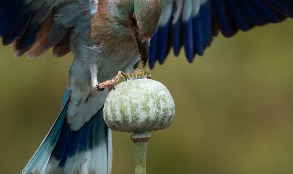 Was für ein starker Vogel. Wie er seine Beute auf der Mohnblume packen will.