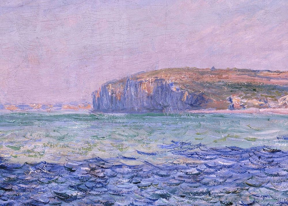 Schatten auf dem Meer. Die Klippen von Pourville, Claude Monet (1882) In seiner Darstellung der Meeresoberfläche zeigt sich Monets impressionistische Technik in ihrer vollen Entfaltung. Schatten, Spiegelungen und Bewegungen werden in einer Reihe von kurzen, geschwungenen Pinselstrichen in reinen, unvermischten Pigmenten wiedergegeben. Betrachtet man das Gemälde aus der Ferne mit halb geöffneten Augen, so fließen die Elemente zu einer optischen Einheit zusammen und die Oberfläche des Gemäldes scheint fast zu vibrieren - genau wie an einem heißen Sommertag am Meer, wo die Wasseroberfläche durch den Wind zu einer Million kleiner, blinkender Spiegel gebrochen wird. Es ist dieser Eindruck, den Monet vermitteln möchte, so wie er ihn an jenem Tag auf den Klippen von Pourville 1882 erlebte.