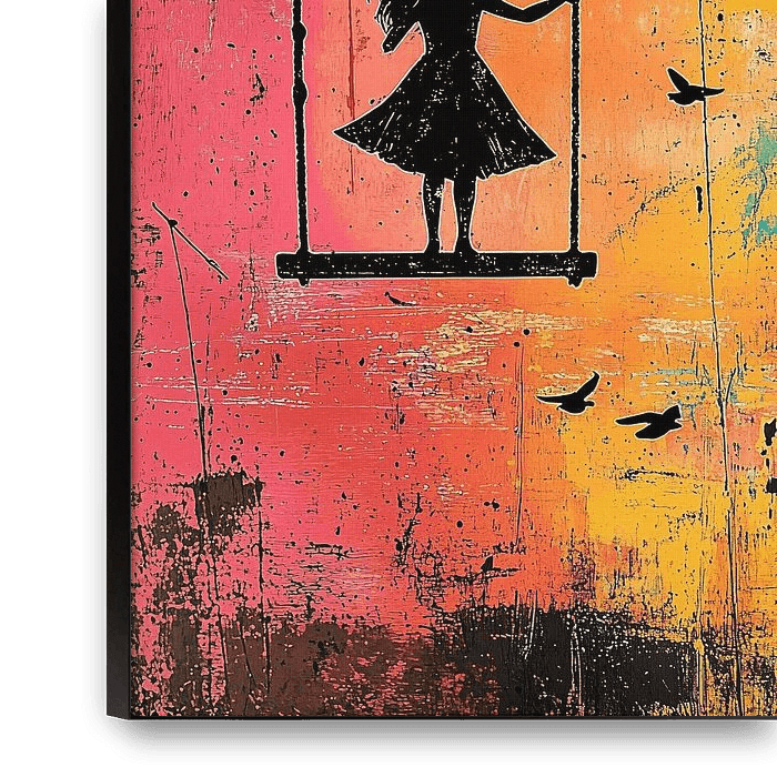 Eine stimmungsvolle digitale Illustration mit der Silhouette eines Mädchens, das auf einer Schaukel vor einem lebendigen Hintergrund in den Farben Rosa, Orange und Türkis schwebt. Umgeben von Vögeln und Zweigen erzeugt das Bild eine verträumte, nostalgische Atmosphäre, die Verspieltheit und Freiheit ausstrahlt. Die verwitterten Texturen…