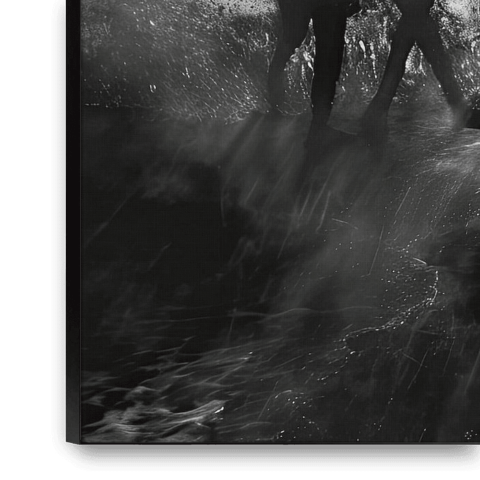 Im Tumult einer Welt in Schwarz-Weiß zeichnen sich Silhouetten gegen den wütenden Ansturm einer Welle ab. Es ist eine eingefangene Szene zwischen Chaos und Ruhe, in der die menschlichen Figuren unbeweglich und entschlossen vor der ungezügelten Kraft des Ozeans stehen. Das Meer krampft und wirft Schaumkronen, die den Himmel zu berühren…