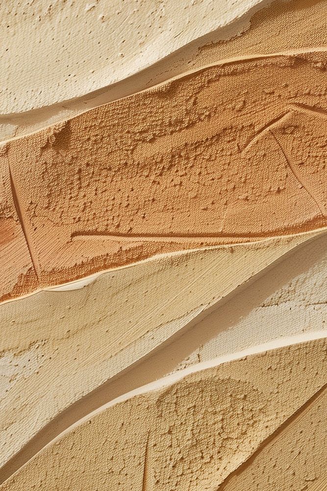 abstrakte Komposition aus geschichteten Texturen und weichen Erdtönen. Die sich überschneidenden Formen und Linien scheinen auf natürliche Elemente wie Sanddünen, Felsen oder Erdschichten zu verweisen. Die Farben reichen von Creme- und Beigetönen bis hin zu warmen Terrakottatönen, die einen harmonischen und beruhigenden Eindruck vermitteln. Die sichtbaren Texturen in den Schichten fügen eine taktile Dimension hinzu, so dass sich das Werk fast greifbar anfühlt.