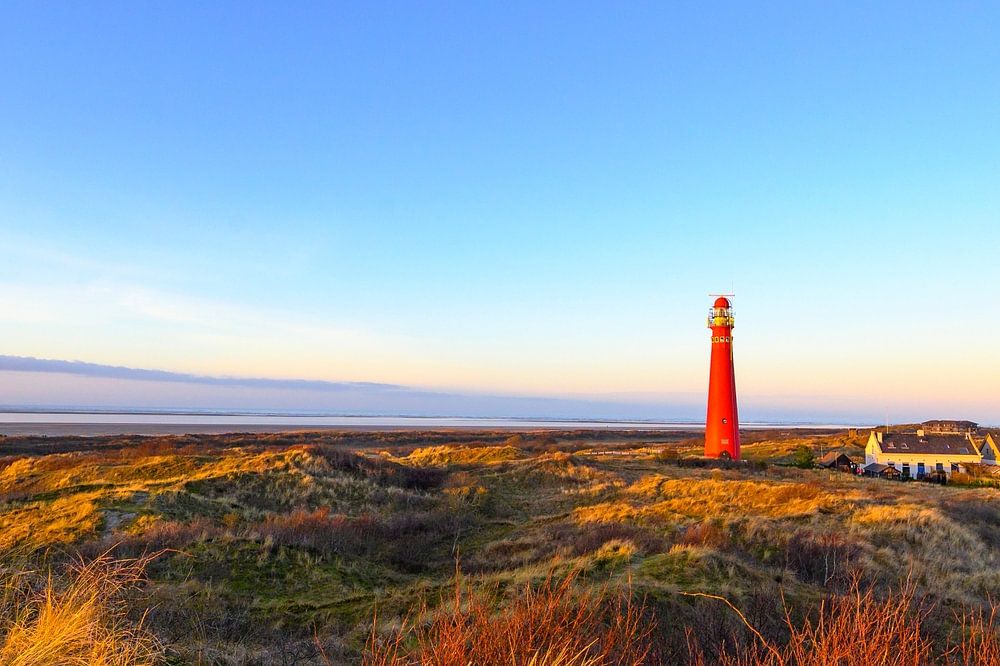 Schiermonnikoog Panoramablick in den Dünen mit dem Leuchtturm bei Sonnenuntergang auf der Watteninsel an einem schönen Wintertag. Schiermonnikoog gehört zu den friesischen Watteninseln und ist bekannt für seine schöne Naturlandschaft, darunter Sandstrände, sanfte Dünen und üppige Feuchtgebiete.