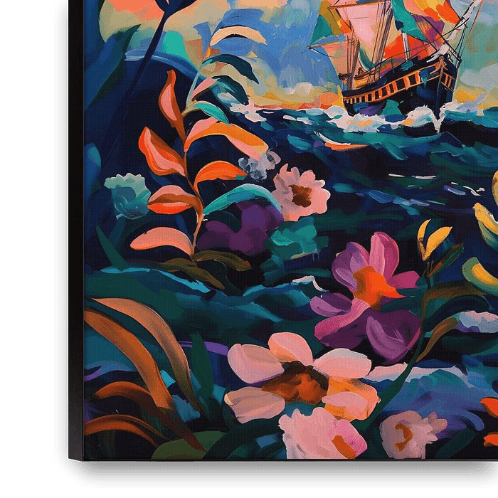 Dieses Kunstwerk zeigt ein Segelschiff, das durch ein bewegtes Meer unter einem dramatischen Himmel segelt. Umgeben von farbenreichen Pflanzen im Vordergrund entsteht eine fantasievolle und lebendige Szene. Die kräftigen Farben in Blau, Pink, Orange und Türkis verleihen dem Bild eine dynamische und moderne Atmosphäre. Die expressive…