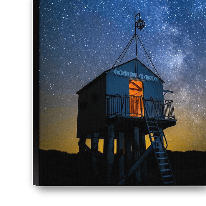 Ich habe dieses Nachtfoto im August 2019 im dunkelsten Teil der Niederlande, der Boschplaat auf Terschelling, gemacht. Dort, am einsamen Strandabschnitt weit hinter Oosterend, befindet sich eine Replika einer Schiffbrüchigenhütte, die einst als Zufluchtsort für gestrandete Schiffbrüchige diente. Während der kristallklaren Augustnacht war die vertikal ausgerichtete Milchstraße außergewöhnlich gut sichtbar. Ich habe verschiedene Bilder des Hauses mit dem galaktischen Zentrum direkt dahinter gemacht. Dieses Foto ist das Ergebnis der Kombination mehrerer Lichteffekte. Die perfekten Bedingungen, die Mehrfachbelichtung und die umfangreiche Nachbearbeitung machen dieses Bild einzigartig.